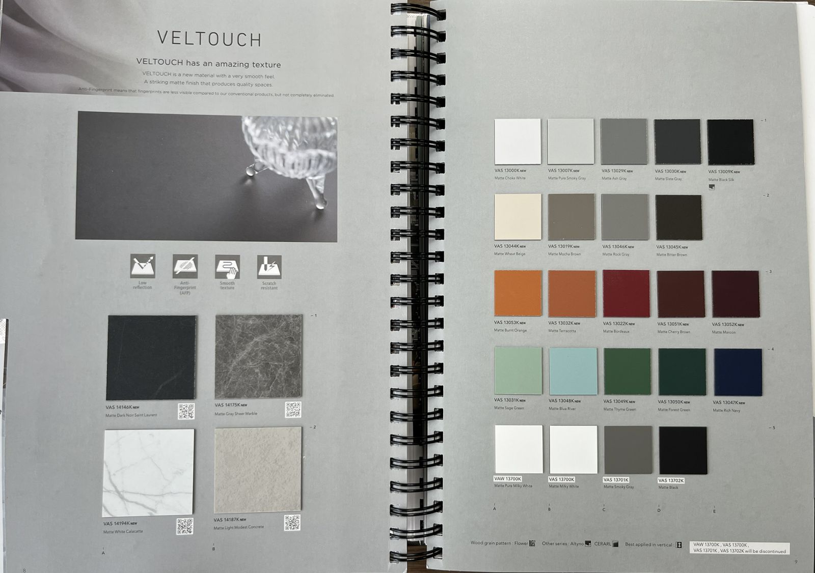 Điểm nhấn đột phá nhất chính là sự mở rộng toàn diện của dòng VELTOUCH. Từ nền tảng các màu đơn sắc cơ bản, VELTOUCH 2026-2027 giờ đây hiện thực hóa công nghệ bề mặt siêu lì và độ mờ tuyệt đối trên các họa tiết Vân đá (Stone)Bê tông (Concrete).